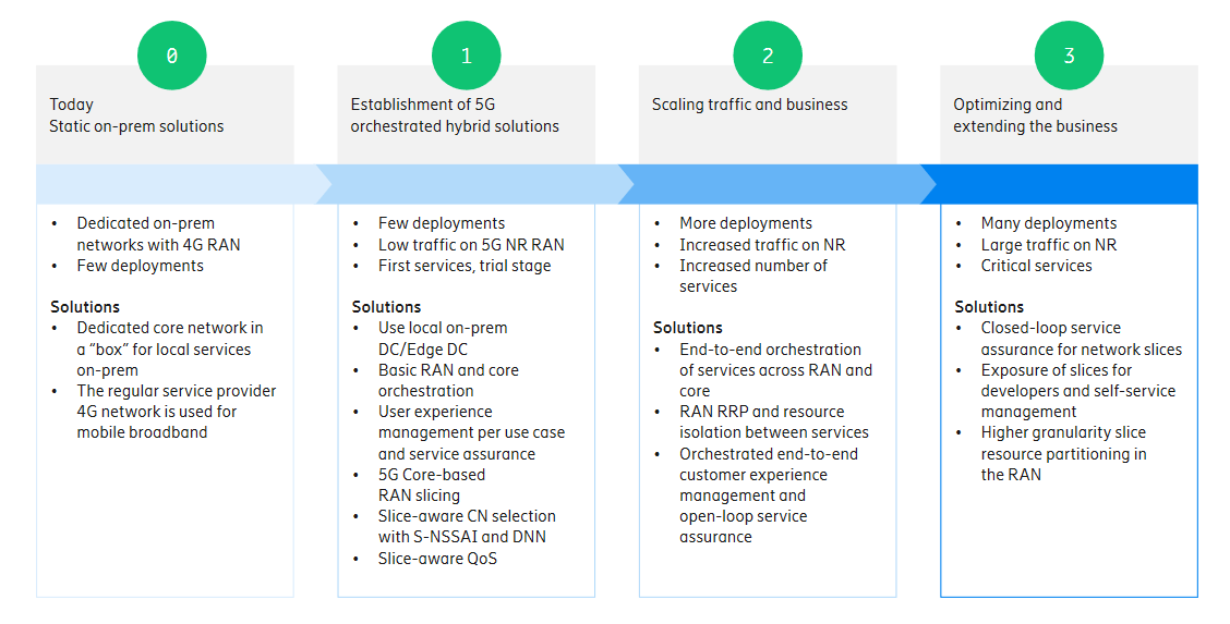 This can be done, Ericsson notes, with a 4G/LTE Radio Access Network (RAN), "provided there is a virtualized core network in place and some service orchestration", but for most, it will start with introducing 5G core and cloud-native "with a container as a system (CaaS) layer like Kubernetes."