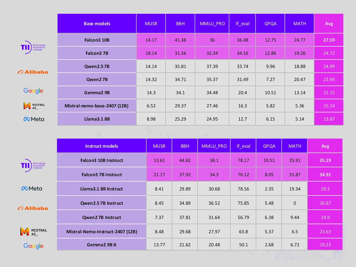 The models appear to perform highly on multiple benchmarks; its 7B-Base version is on par with Alibaba's Qwen2.5-7B in the under-9B category and its 10B-Base a category leader in the under-13B category. (TII chart below.)