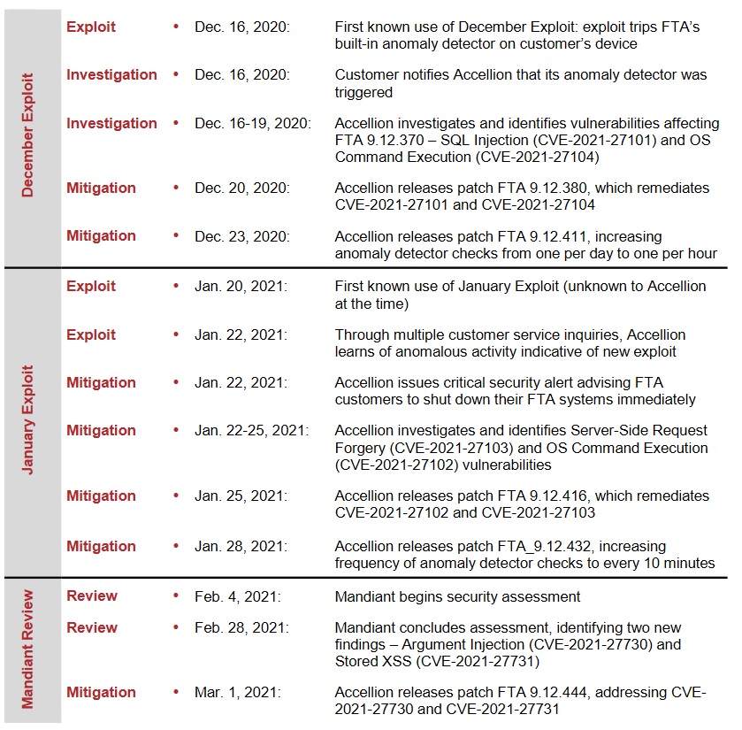 March 1 analysis by security firm Mandiant Accellion identified two zero-day vulnerabilities that were part of the December Exploit—CVE-2021-27101 and CVE-2021-27104 (a SQL injection and OS command execution bug respectively)—and two zero-day vulnerabilities that were part of the January Exploit—CVE-2021-27102 and CVE-2021-27103 (A server-side request forgery and another OS command execution bug.)