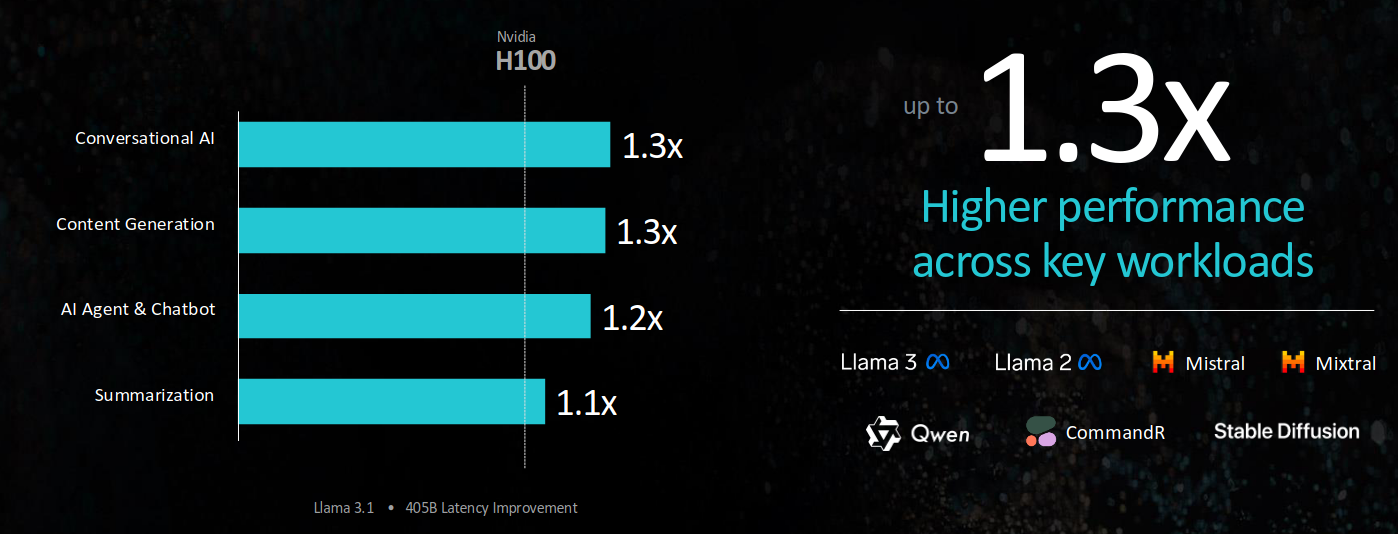 Also: “1.3X greater peak theoretical FP16 and FP8 compute performance compared to H200… up to 1.3X the inference performance on Mistral 7B at FP16, 1.2X the inference performance on Llama 3.1 70B at FP8 and 1.4X the inference performance on Mixtral 8x7B at FP16 of the H200.