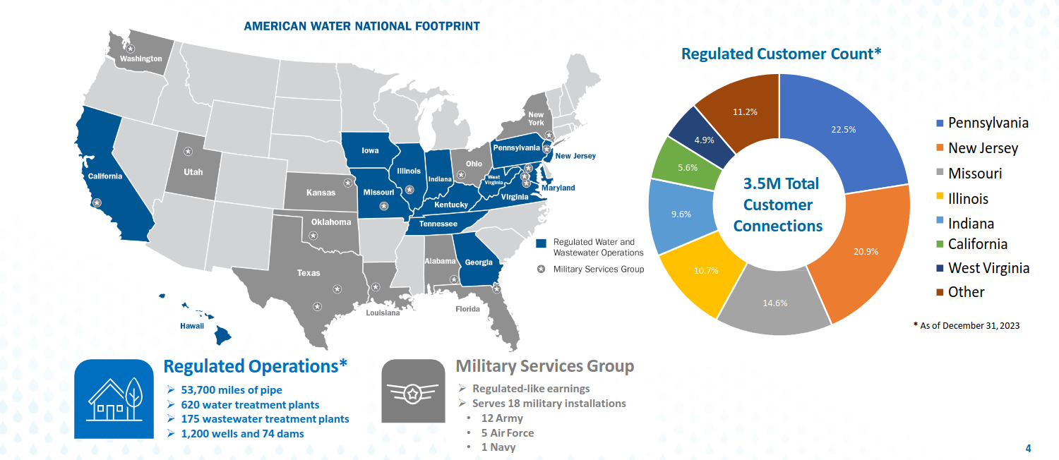 American Water operates 53,700 miles of pipe, 1,200 wells, 620 water treatment plants, 175 wastewater treatment plants and 74 dams.