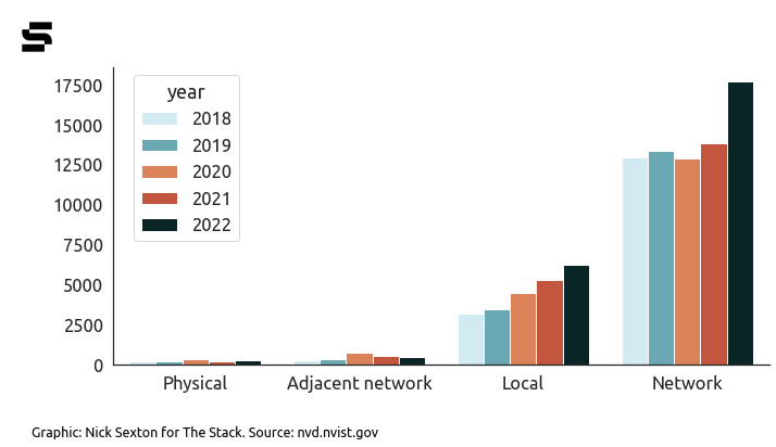 Data analysis by Nick Sexton (Twitter @nickjsexton; Mastodon @nicksexton@fosstodon) who used the NVD API to retrieve data from all logged vulnerabilities for the last five years and wrote a Python script to parse the raw json data to create human-readable fields for each vulnerability entry in the database and reconcile the entries using cvssV2 with cvssV3 reporting schemes. For the CWE data, the data was retabulated on a CWE level (each vulnerability may list multiple CWEs). The data was tabulated and graphed using the Pandas and Seaborn Python packages.)