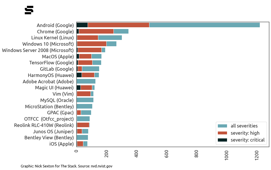 This does not suggest that they were the least secure software products of 2022. Rather, simply that security researchers reported the most vulnerabilities in them. This may be due to mature bug bounty programmes. (The Chrome bug bounty programme, for example, launched in 2010 and has an expansive scope.)