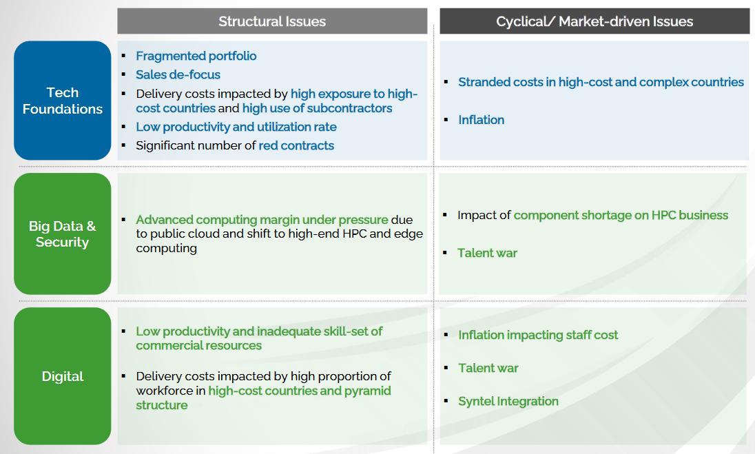 Atos blamed "structural issues" like a fragmented portfolio, "high exposure to high-cost countries and high use of subcontractors", a "significant number of red contracts", inflation affecting staff costs, and "low productivity and inadequate skill-set of commercial resources" for its troubles. The proposal comes just 16 months after rival DXC walked away from a buyout proposal by Atos widely rumoured to have been priced at $10 billion.