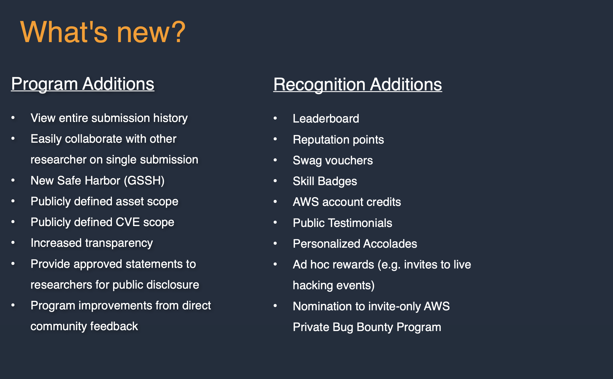 "The recent VDP on HackerOne is a little confusing as to whether it is a bug bounty or just a separate flow for their existing vulnerability disclosure process, which historically is done by emailing aws-security@amazon.com.