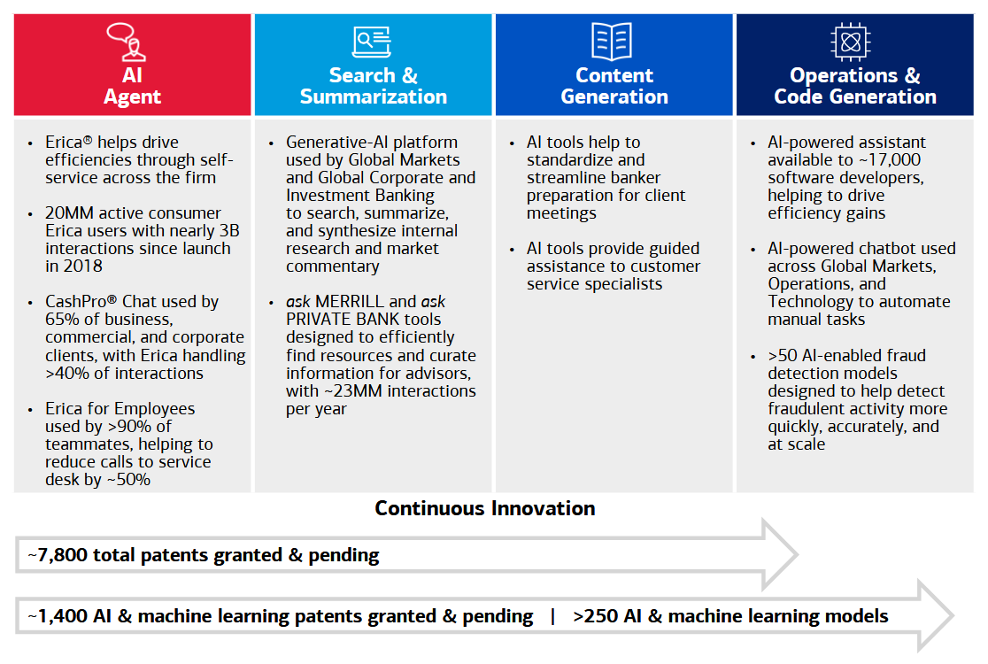 Moynihan added last month: “We have 17,000 programmers using AI coding technology today saving 10% to 15% in code generation costs and we expect that to continue to rise. Overall, we have 1,400 AI patents and have created over 250 AI and learning models in the company. We are currently working through many dozens of our AI proof of concepts…”