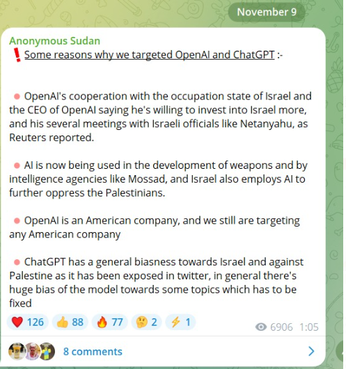 The attacks have been claimed by Russian threat group "anonymous Sudan" which said in its Telegram channel that the attacks were due to OpenAI's support of Israel.