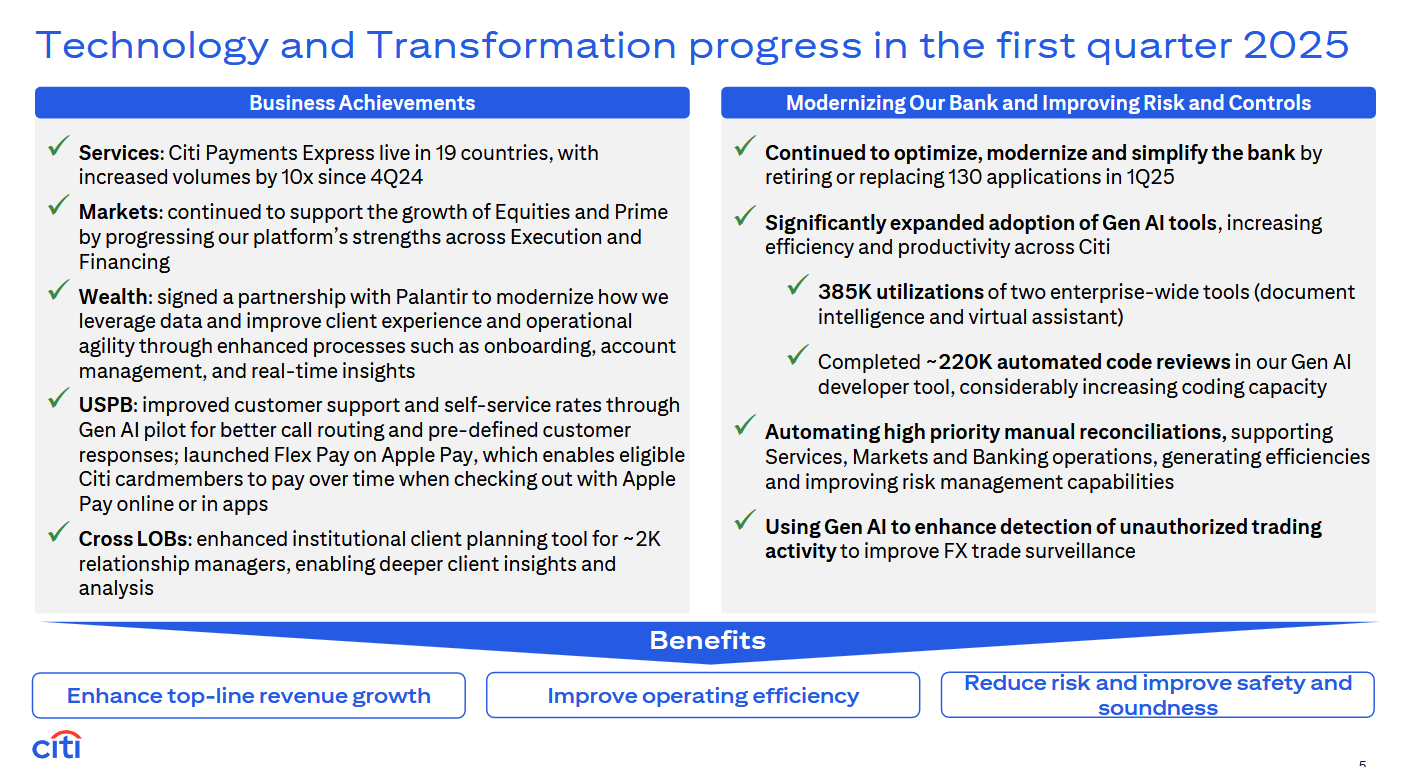 Digital and organisational transformation “remains our #1 priority, and we will continue to make the investments needed, specifically as it relates to data and regulatory reporting” affirmed CEO Jane Fraser. (Citi continues to overhaul its data environments following a series of fines.)