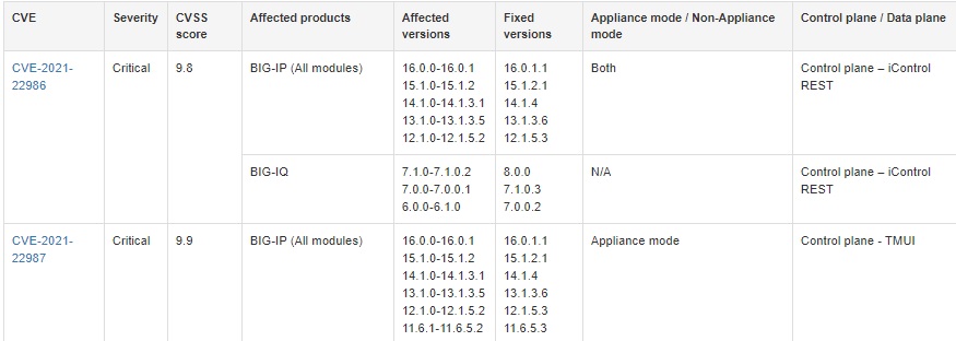 Among the worst, a CVSS 9.8 bug (CVE-2021-22986) in its iControl REST API for BIG-IP: an externally accessible tool designed to provide "granular control" over BIG-IP configuration and management across data centres.