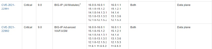 Four of today's new bugs are critical, including CVE-2021-22987, a CVSS 9.9 rated bug in F5's Traffic Management User Interface (TMUI) and CVE2021-22992, for which a malicious HTTP response to an Advanced WAF/BIG-IP ASM virtual server with Login Page configured in its policy can alllow RCE "leading to complete system compromise."