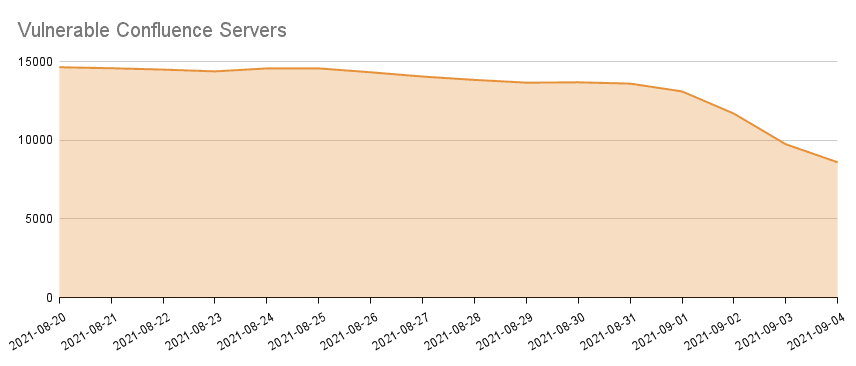 By Sunday, September 5 there were still 8,597 vulnerable Confluence instances out there for the taking, according to excellent analysis by Censys (which clearly tracks the less-than-blistering pace of patching...)