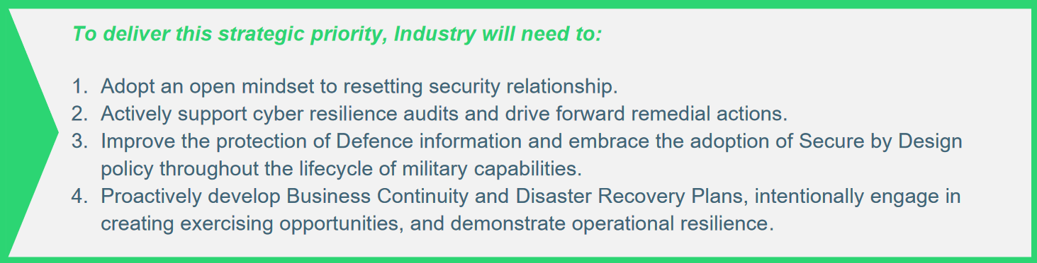 Among the strategy's promises is more openess from MOD, which will aim to "adopt a default ‘share’ posture... where policy permits" and, critically, to "reset the relationship" with industry: something the report warns may require an "open mindset to resetting security relationships" from enterprise partners as MOD looks to push resilience requirements further up it supply food chain, to include resilience audits and remediation.