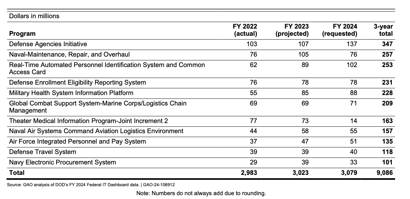 The investigation found that DOD’s planned expenditures for 21 selected IT "business programs" totalled $9.1 billion between 2022 and 2024. The four largest programs accounted for half the total spend.
