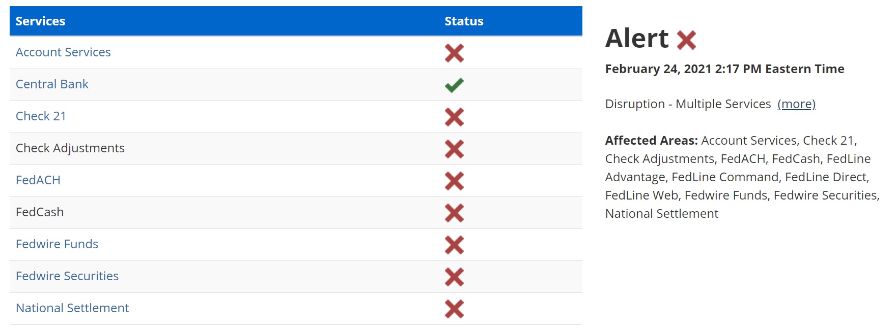 Account Services, Central Bank, Check 21, Check Adjustments, FedACH, FedCash, FedLine Advantage, FedLine Command, FedLine Direct, FedLine Web, Fedwire Funds, Fedwire Securities, National Settlement were all understood to be unavailable for over an hour.