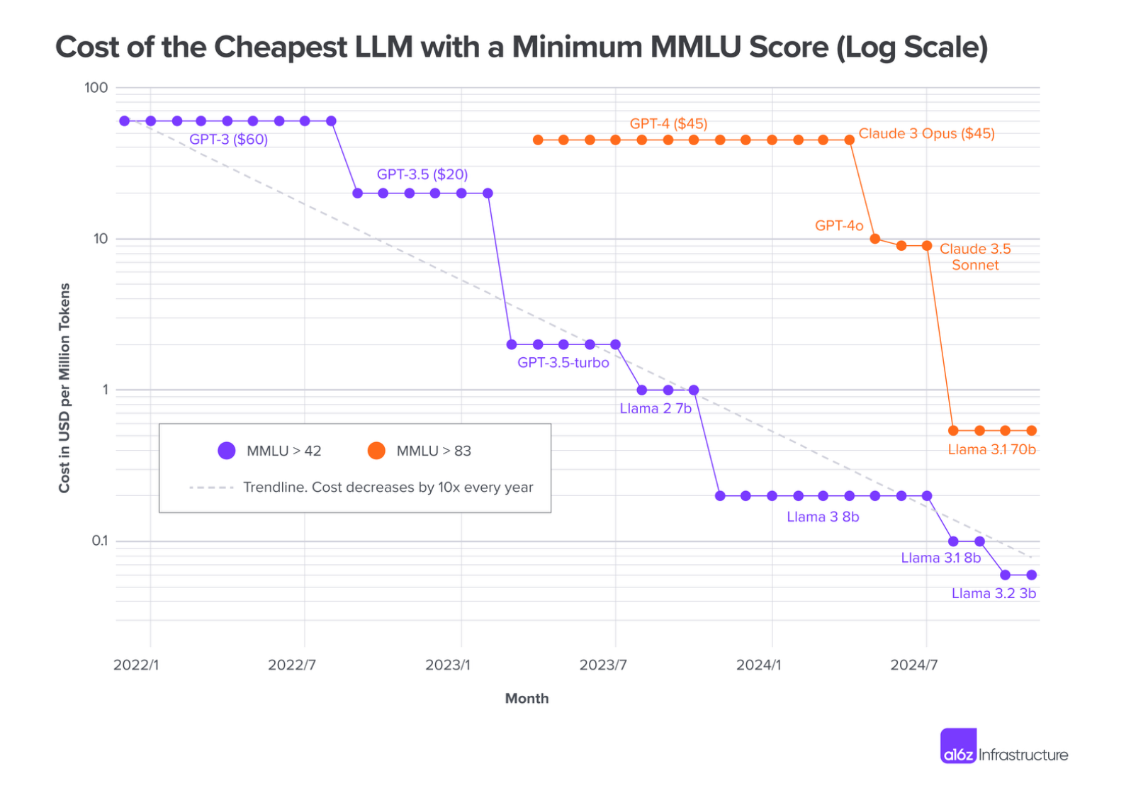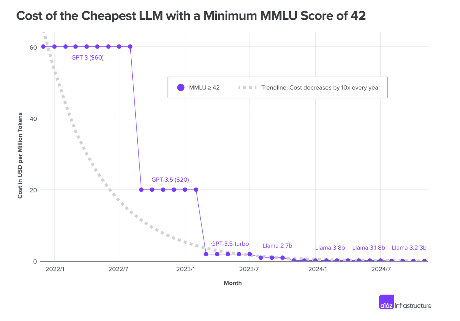 "When GPT-3 became publicly accessible in November 2021, it was the only model that was able to achieve an MMLU of 42 - at a cost of $60 per million tokens," the VC wrote. "As of the time of writing, the cheapest model to achieve the same score was Llama 3.2 3B, from model-as-a-service provider Together.ai, at $0.06 per million tokens. The cost of LLM inference has dropped by a factor of 1,000 in 3 years."