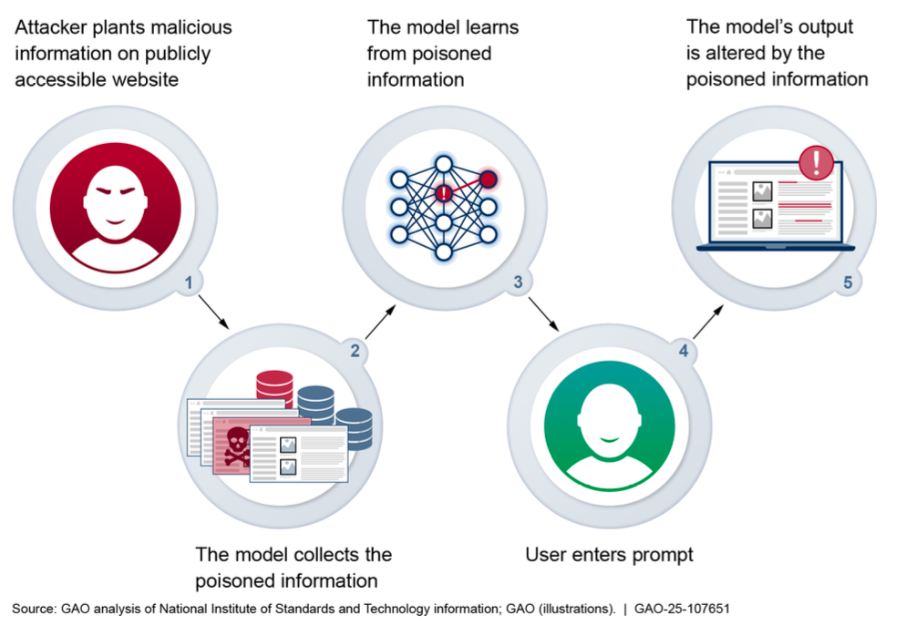 The watchdog discussed data poisoning attacks (illustrated in the image above) as an example of an emerging security threat generated by the rise of AI. These attacks change the behaviour and outputs of a generative AI system by manipulating its training data or process.