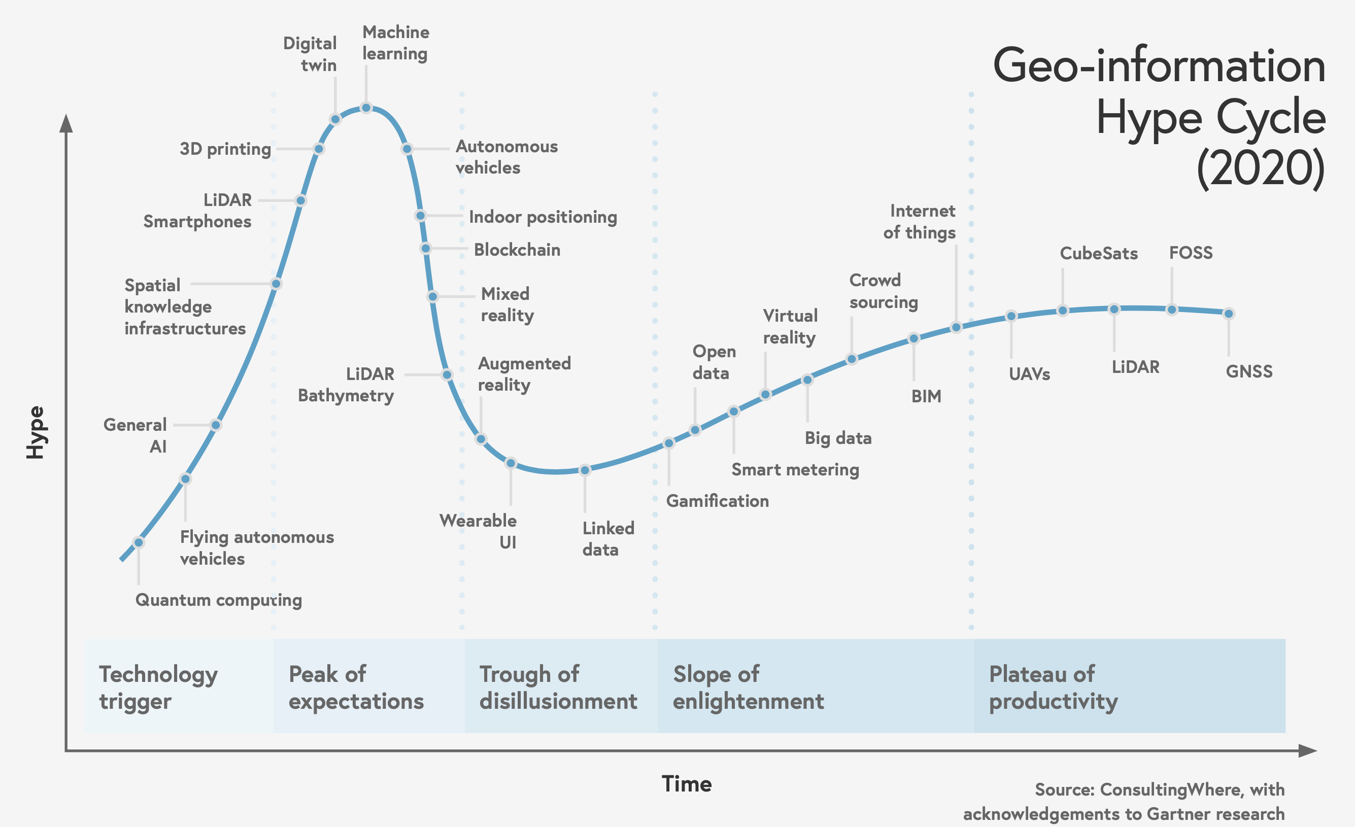 But there is still a long way to go before some of the promises of geospatial data are fully realised. ConsultingWhere produced a version of Gartner’s Hype Cycle focused on geo-information applications, and it’s clear from this how many use-cases are still facing a slow journey through the trough of disillusionment.