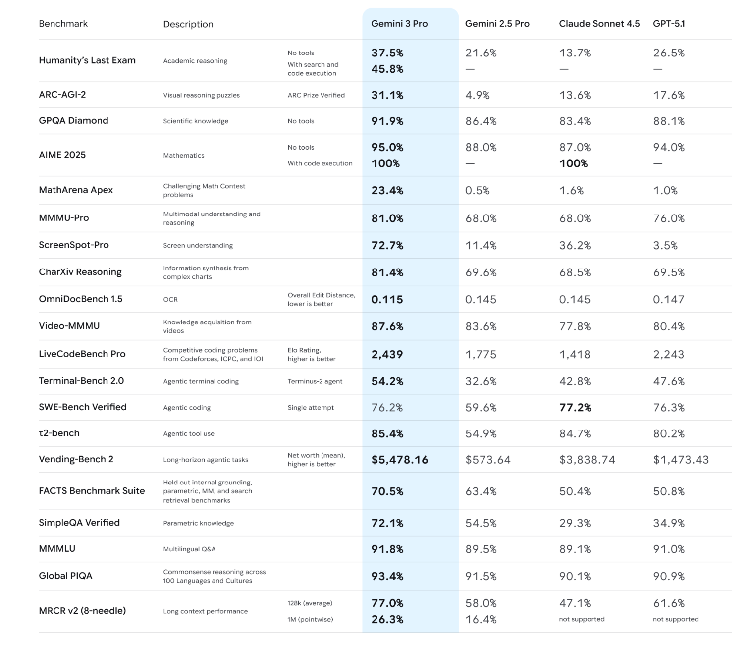 Google said Gemini 3 topped multiple leaderboards, and managed “an unprecedented 45.1% on ARC-AGI-2” (a challenging reasoning benchmark) “demonstrating its ability to solve novel challenges.”