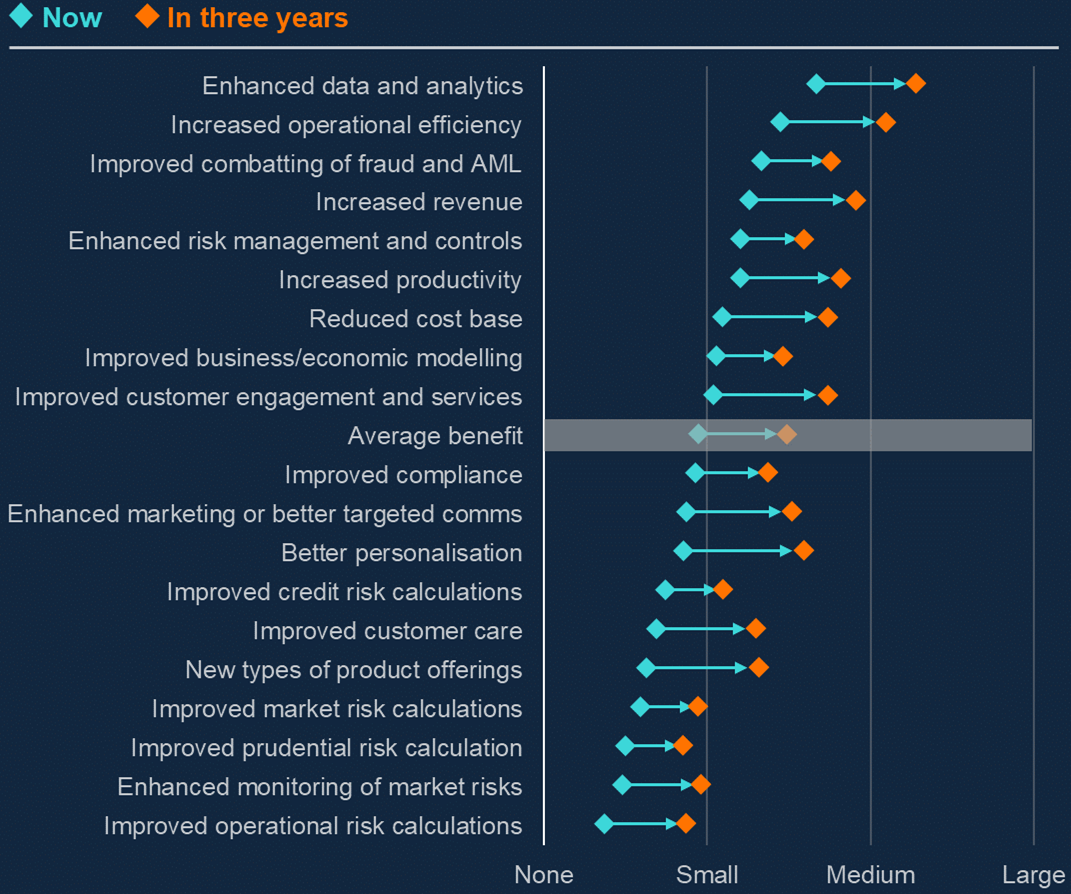 The advanced areas when it came to ML deployment were credit underwriting and insurance pricing/underwriting. Other advanced deployments spanned expected loss accounting models; claims handing; monitoring for insider trading or market manipulation; to direct queries within customer interfaces; know your customer (KYC) checks; trading strategy and execution; payments authorisation; and staff wellness programmes.