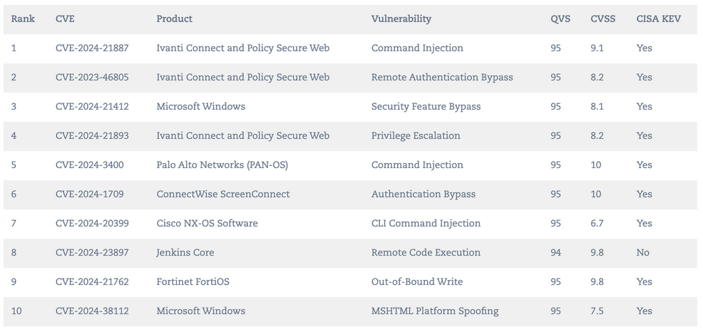 Just how much mayhem a clutch of bugs can cause is illustrated by the Top 10 Exploited chart in the report. The top two spots were taken by CVE-2024-21887 and CVE-2023-46805, both related to Ivanti Connect and Policy Secure Web, the former representing command injection, the latter a remote authentication bypass. They were initially spotted by security researchers at Volexity, which identified attacks by a Chinese state level actor, and were rapidly exploited at scale as of January.