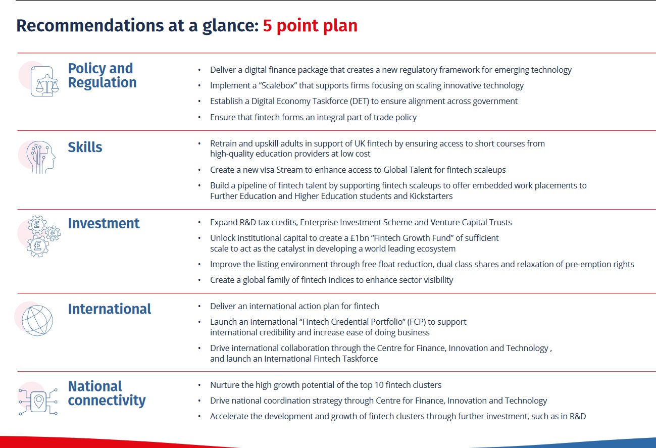 The Kalifa Review, published Friday February 26, urges everything from the “diversion” of UK private pension scheme moneys to a “Fintech Growth Fund”; a “three-year strategy” for the UK’s top 10 fintech clusters; a government-backed Centre for Finance, Innovation and Technology to “coordinate targeted fintech policies”; while simultaneously urging liberalisation on everything from competition rules (“consolidation will be critical”) to regulations governing what fintechs need to do when they go public (“relaxation of pre-emption rights”).