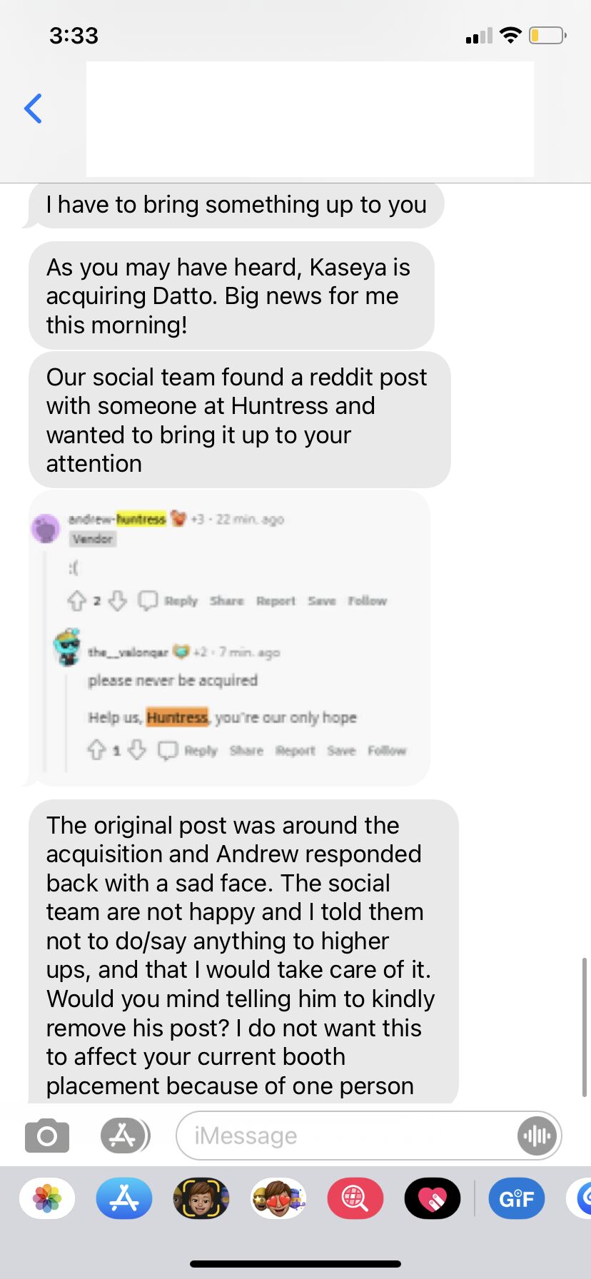 One of those comments, another sad-face, from Andrew Kaiser, VP of sales at security platform Huntress Labs, sparked its own sub-drama. As Kaiser posted on LinkedIn, Huntress’s Kaseya contact got in touch with the firm with what appeared to be a threat against Huntress’s booth space at Kaseya Connect.