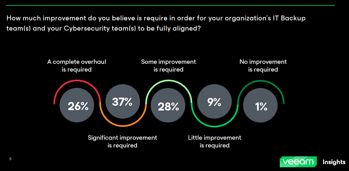 Chiefly that is that for the third year in a row, more than half of organisations (63%) believe that there is either a “significant improvement” or “complete overhaul” needed for their organizations to be aligned between their backup and cybersecurity teams.