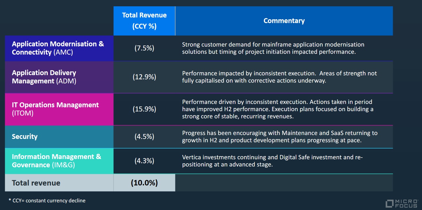 The UK-based software and IT management services firm continues to feel the pain of its misguided 2018 acquisition of HPE's software business for $8.8 billion; writing off $2.8 billion in 2020 as an impairment charge "driven by changes in the Group’s trading performance and overall environment when compared to the original projections produced at the time of the HPE Software acquisition" it said in an earnings statement.