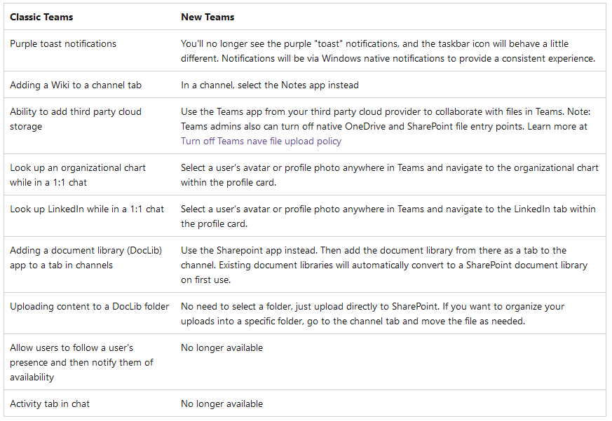 For example the ability of “users to follow a user's presence and then notify them of availability” has mercifully been removed outright. Less immediately clear was precisely what Microsoft means in the highlighted passage of its “Classic Teams” and new Teams client feature comparison above and The Stack has followed up to clarify.