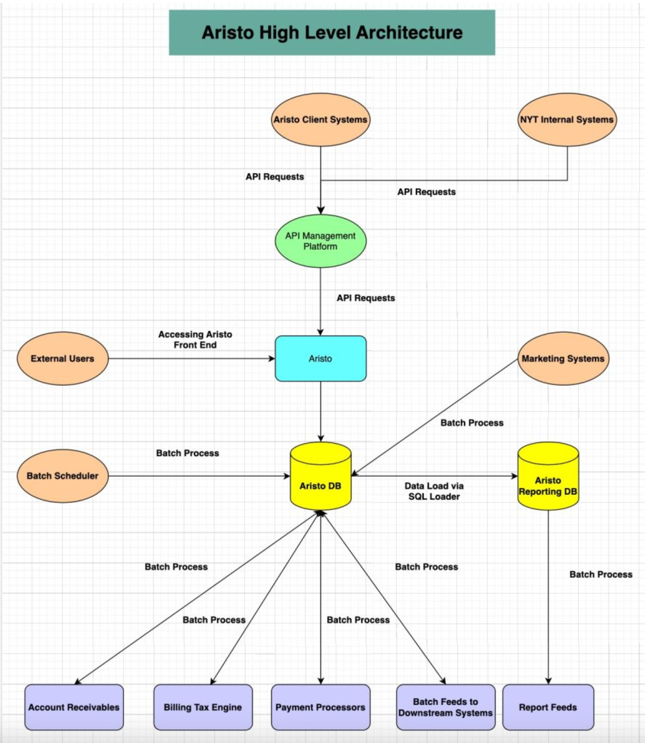 Clients access it via an API Management Platform, while external vendors use a UI for updates, and internal systems send batch feeds to update data. A batch scheduler processes inputs from APIs, UI, and batch systems, generating data for downstream systems like billing, payments, and reporting.