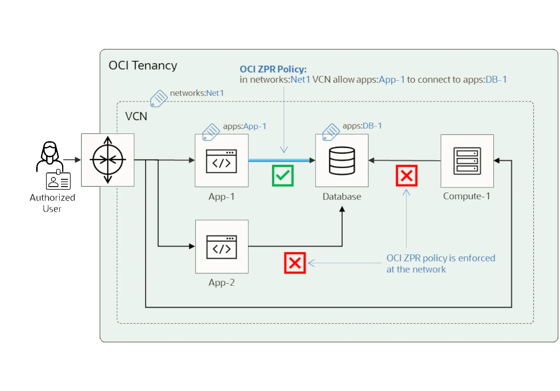 - Enforcement at the network layer: OCI ZPR policies are enforced at the network layer, helping ensure that all traffic complies with the defined security intentions.