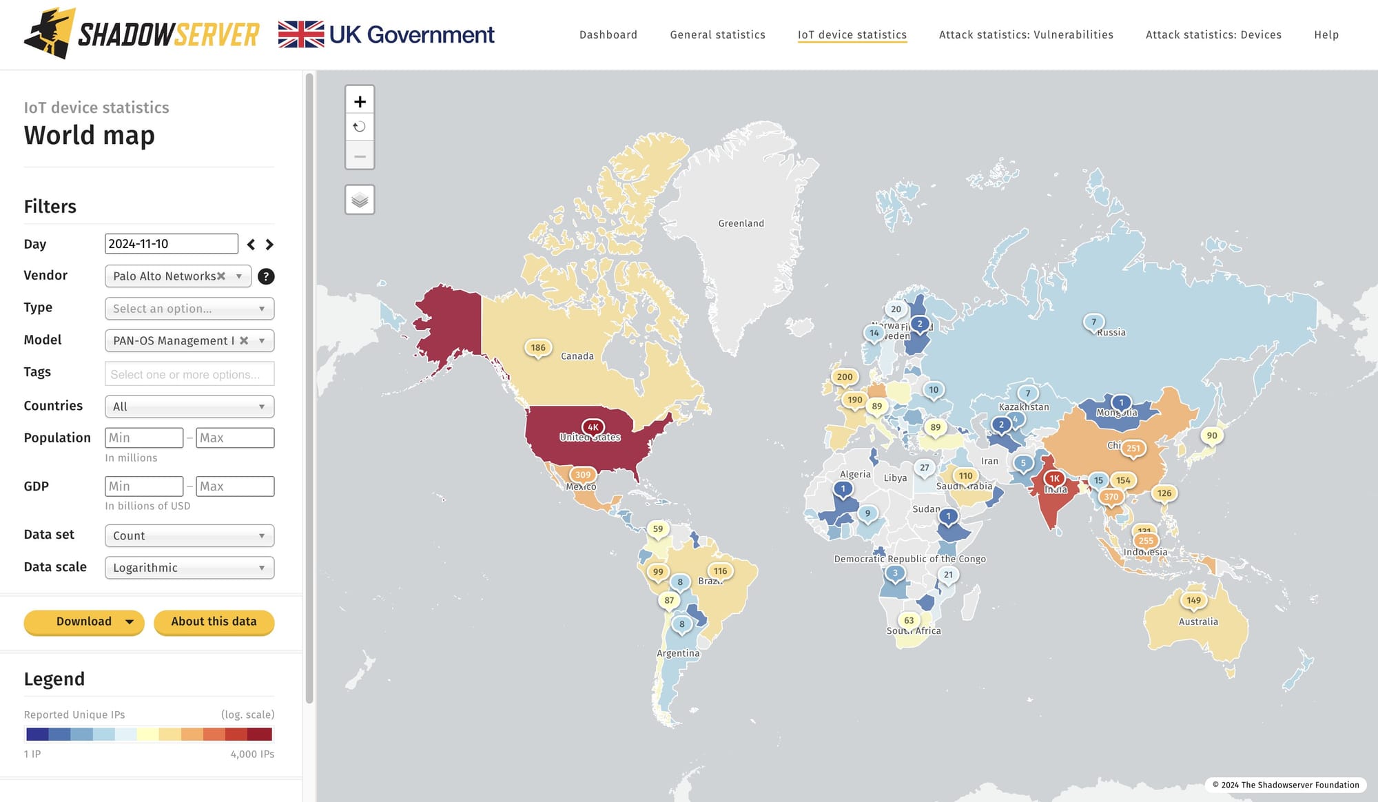 A search by the Shadowserver Foundation however showed some 11,000 PAN-OS management interfaces publicly exposed to the internet. The majority are in the US (4,000) and India (1,000) with 200 in the UK.