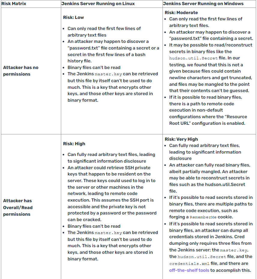 CVE-2024-2389, can allow an unauthenticated attacker with no permissions to leak the first couple of lines of arbitrary text files on a vulnerable Jenkins server. However, an authenticated attacker can retrieve entire text files, using the connect-node CLI command.
