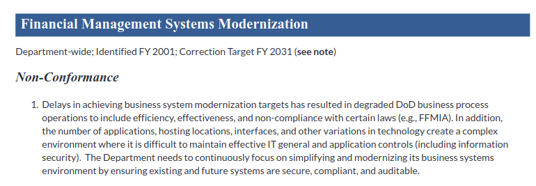 DoD had identified major financial management IT systems issues as far back as 2001 and initially set a “correction target date” of 2028. Sadly, 27 years were not long enough: This month, it pushed the target date back to 2031, blaming a “delay in the implementation of corrective actions.”