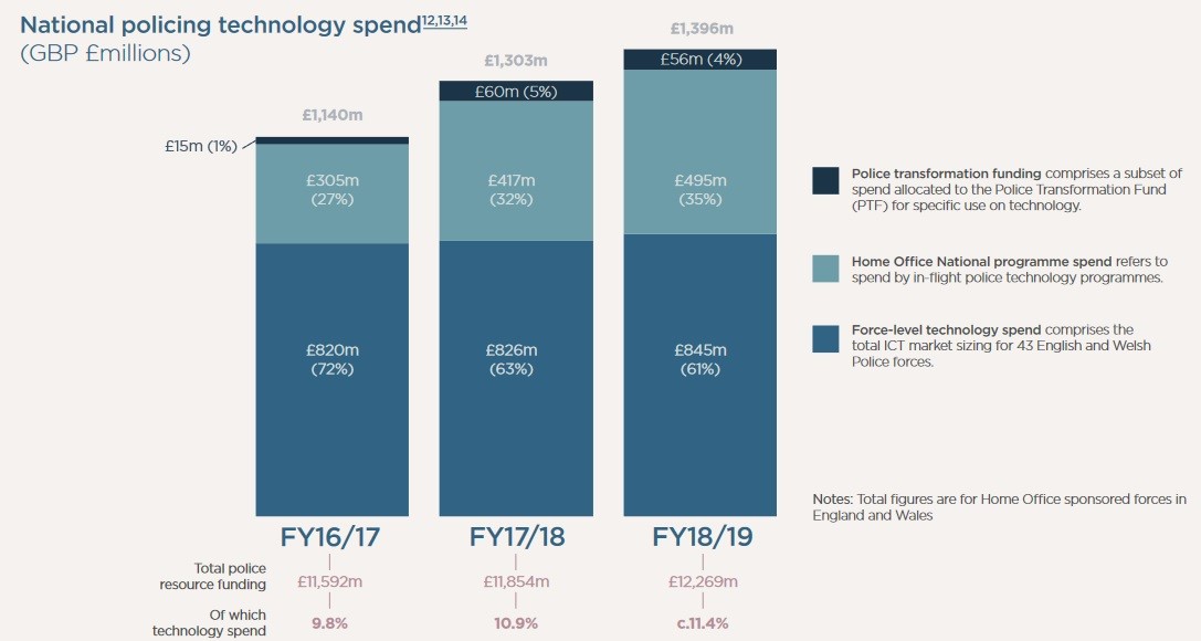 In 2018, the police service in England and Wales spent ~£1.4 billion on technology. Approximately 30% of technology staff spend is on resources to maintain on premise infrastructure, with the IT budget approximately 11% of the annual policing spend. As the Digital Strategy notes: "The implementation of additional technology places an upward pressure on IT costs which we must mitigate by reducing expenditure on our legacy estate.
