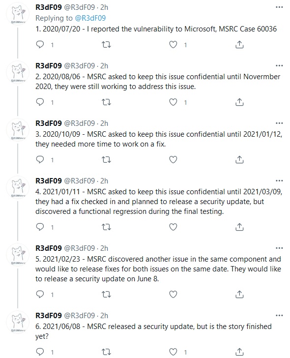 One of the other original CVE-2021-1675 finders, Zhipeng Huo, said on Twitter that Microsoft's response to the original disclosure had been dire, with MSFT taking over a year to issue a fix that didn't work.