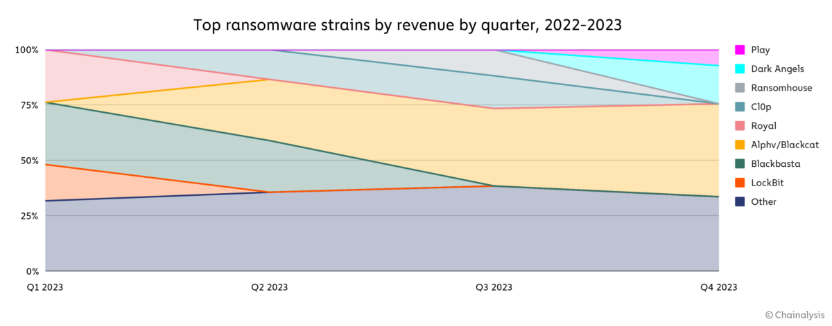 Chainalysis said it tracked numerous new ransomware group entrants and offshoots in 2023, “who... often reuse existing strains’ code.”