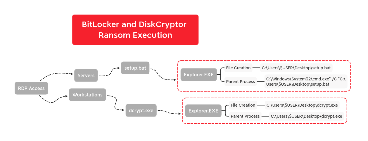 "Utilizing the Plink RDP connection, the threat actor dumped LSASS using Task Manager. Thirty minutes later, the threat actor started using a domain administrator account. Using the stolen Domain Admin account, adversaries performed port scanning with KPortScan 3.0 [aand then moved laterally using RDP. Targeted servers included backup systems and domain controllers. The threat actor also deployed the FRP package to these systems after gaining access. Finally, the threat actors deployed setup.bat across the servers in the environment using RDP and then used an open source disk encryption utility to encrypt the workstations.