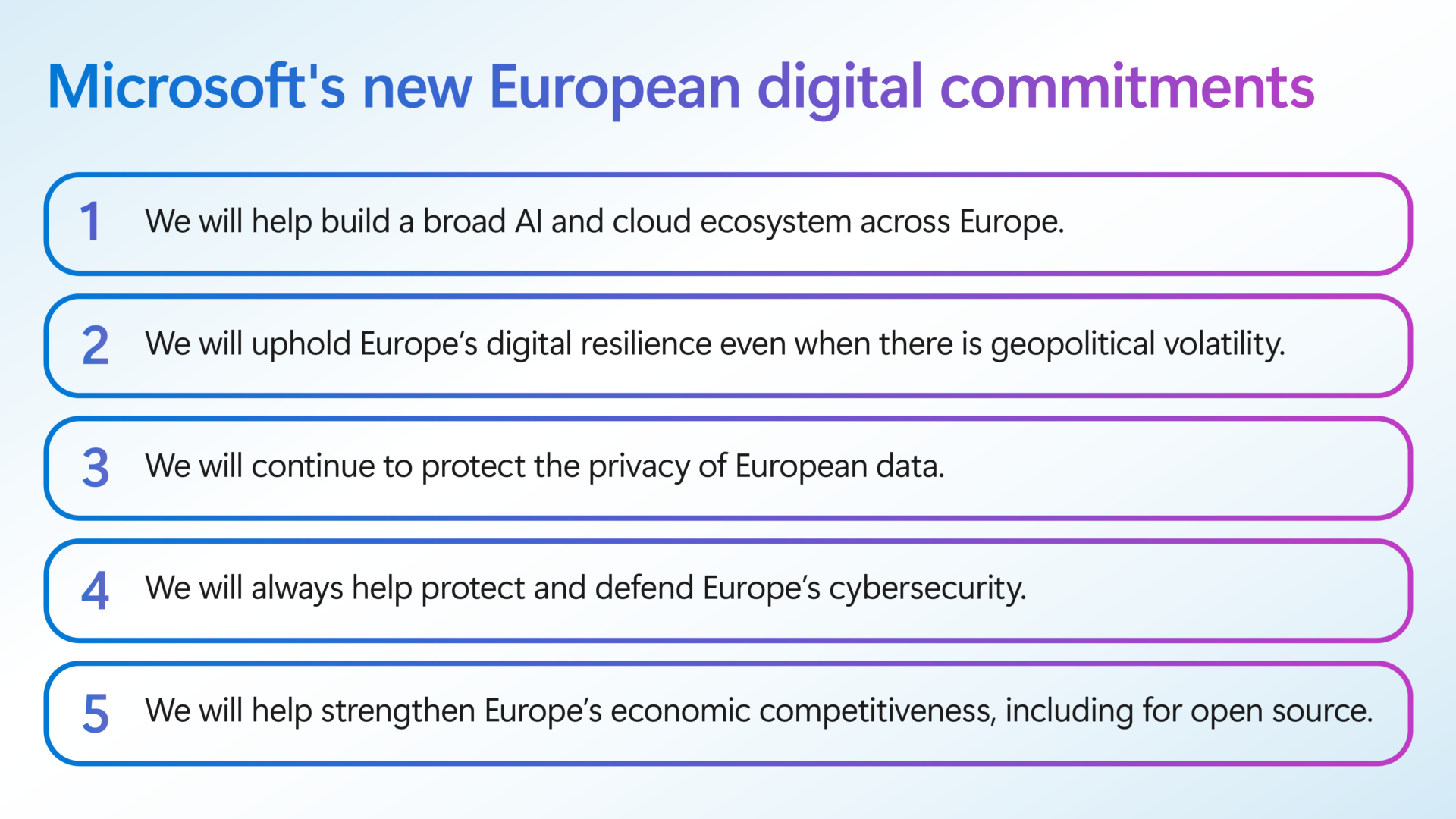 We recognize the importance of a diversified technology ecosystem, and we are committed to collaborating with European participants across the tech ecosystem,” Smith said, as Microsoft made five European commitments including ongoing investment in “sovereign” cloud data centres. He highlighted a partnership with Capgemini and Orange in France called “Bleu” that offers Microsoft Azure cloud services and Microsoft 365 productivity tools “operated under French control” and a similar sovereign cloud initiative in Germany via a partnership between Microsoft, SAP, and consultancy Arvato Systems that through SAP subsidiary, Delos Cloud GmbH, is creating a “sovereign cloud platform for the German public sector… in German datacenters and operated by German personnel.