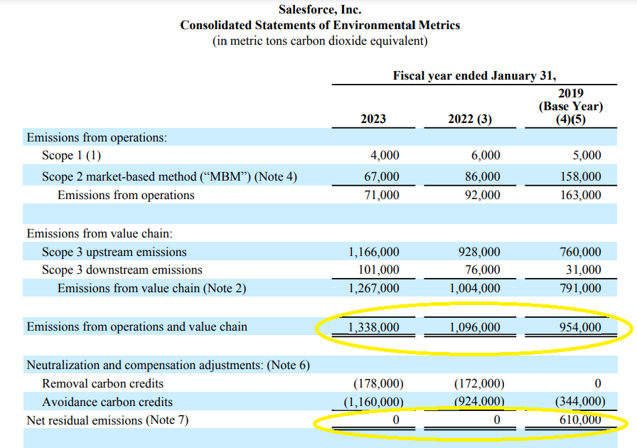 Salesforce claims in a sustainability FAQ to have already achieved “net zero residual emissions” – even as emissions from its operations and value chain have actually gone up in absolute terms year on year. (Its own reporting shows a rise from 954,000 metric tons of carbon dioxide equivalent in 2019, to 1,096,000 in 2022, and 1,338,000 in 2023.)