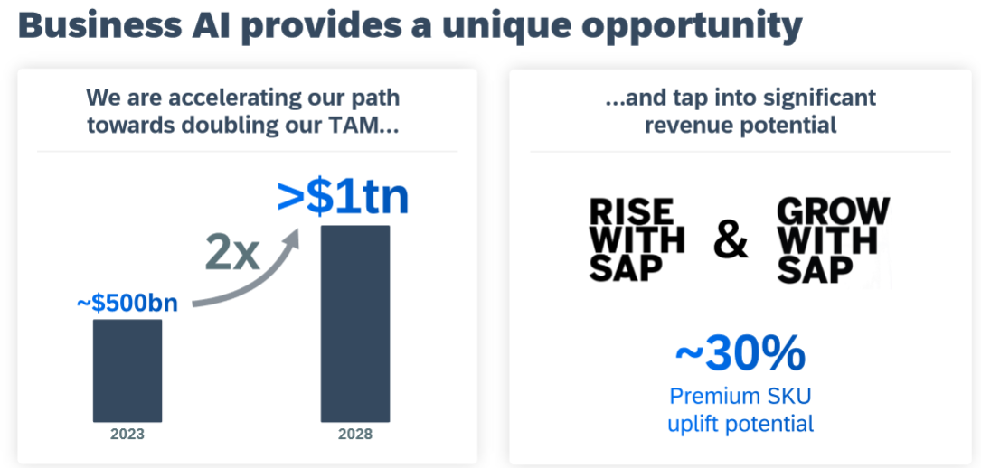 Warming to the AI theme, the SAP CEO added: “Imagine your ERP system using embedded ESG data and business data to decarbonize the supply chain by 5%, simply by asking for it. There will be a step change in uncovering new insights that lead to better business decisions. Based on external forecasts and our own calculations, we see a potential doubling of our addressable market to $1 trillion by 2028 with AI a key contributor.”