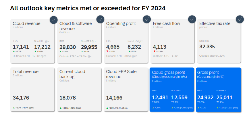 Total revenues for 2024 were €34.176 billion, up 10%. SAP also boasted of a €63 billion “cloud backlog” (contractually committed cloud revenue SAP expects to recognize over 12 months) on the Q4 earnings call.