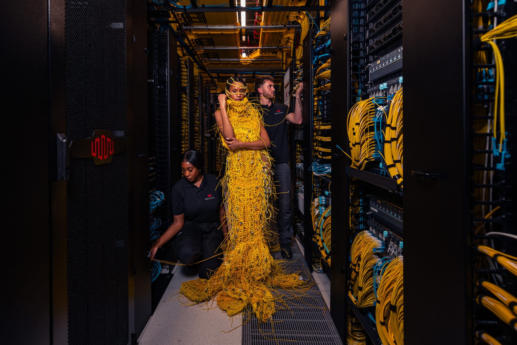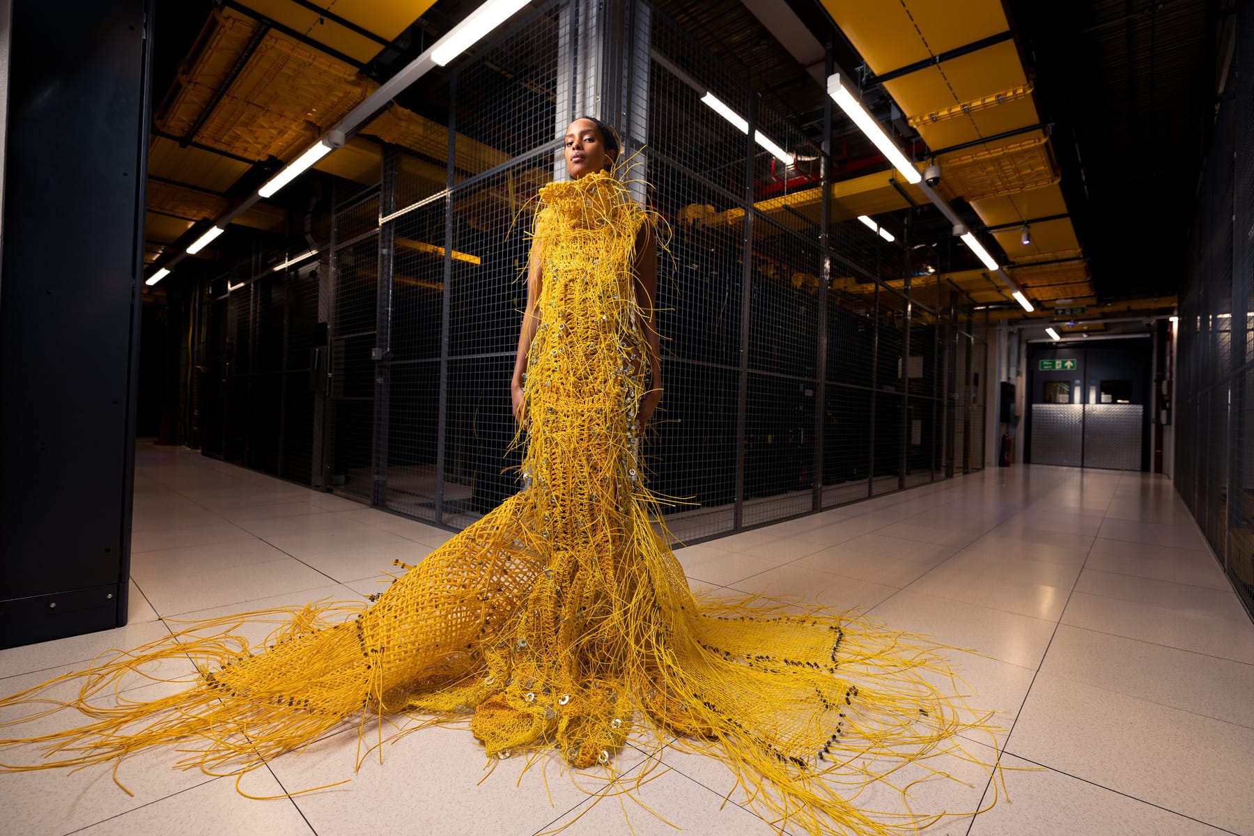 This is, in fact, an as-yet-uncredited model*, wearing a dress made from repurposed data centre castoffs designed by London designer Maximilian Raynor, who has also made creations for the likes of Lady Gaga. (Not, sadly, coming to LD6 anytime soon, that The Stack is aware of.)