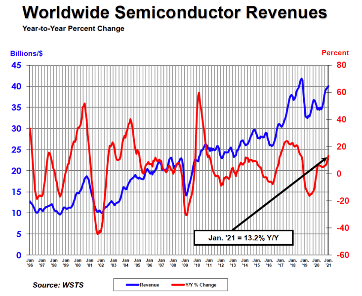 Global semiconductor industry sales hit $40 billion in January 2021, an increase of 13.2% over the January 2020 total of $35.3 billion, according to new figures from the Semiconductor Industry Association (SIA), which represents 98% of the U.S. semiconductor industry by revenue