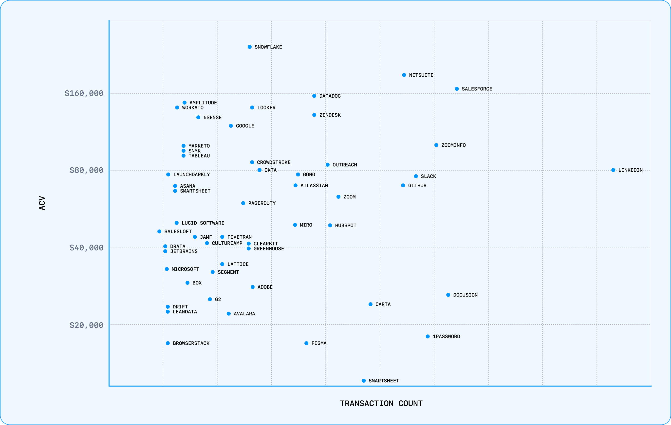 Annual Contract Value (ACV) analysis by Vendr suggested that Snowflake, Netsuite and Salesforce were earning some of the biggest deals still, with Zoominfo, Datadog and LinkedIn all also performing well (see below.)