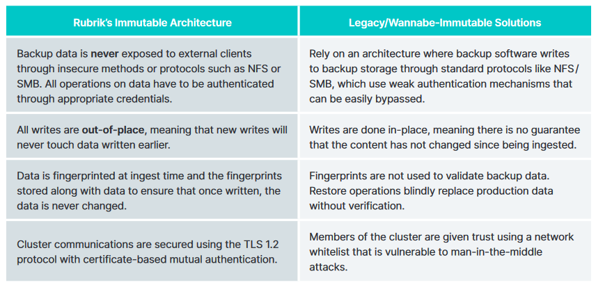 (Rubrik has an API-first design that requires authentication to all endpoints that are used to operate it. Any APIs which could potentially cause data removal within Rubrik are also blocked by default. Those needing to get around this need to get privileges granted on a “token by token basis to allow scripts to consume these endpoints.” n.b. For those wanting to take a deeper dive into Rubrik cluster communications, file system and logical layer etc. can take a look at this whitepaper by former Rubrik Chief Technologist Chris Wahl, which captures some details.)