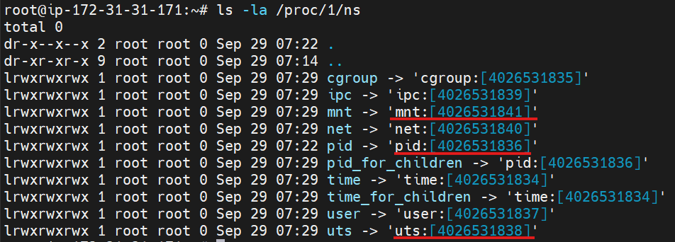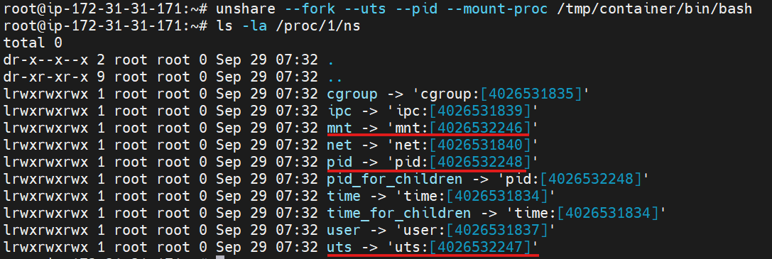 You'll see that the UTS, mount, and PID namespaces have different IDs and that the PID namespace took place because there are no host-related processes visible within this container: