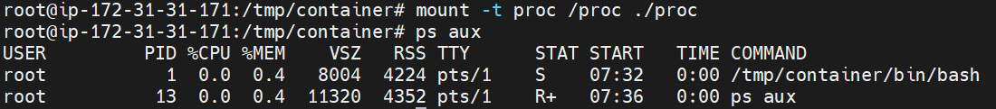 unshare --fork --uts --pid --mount-proc /tmp/container/bin/bash