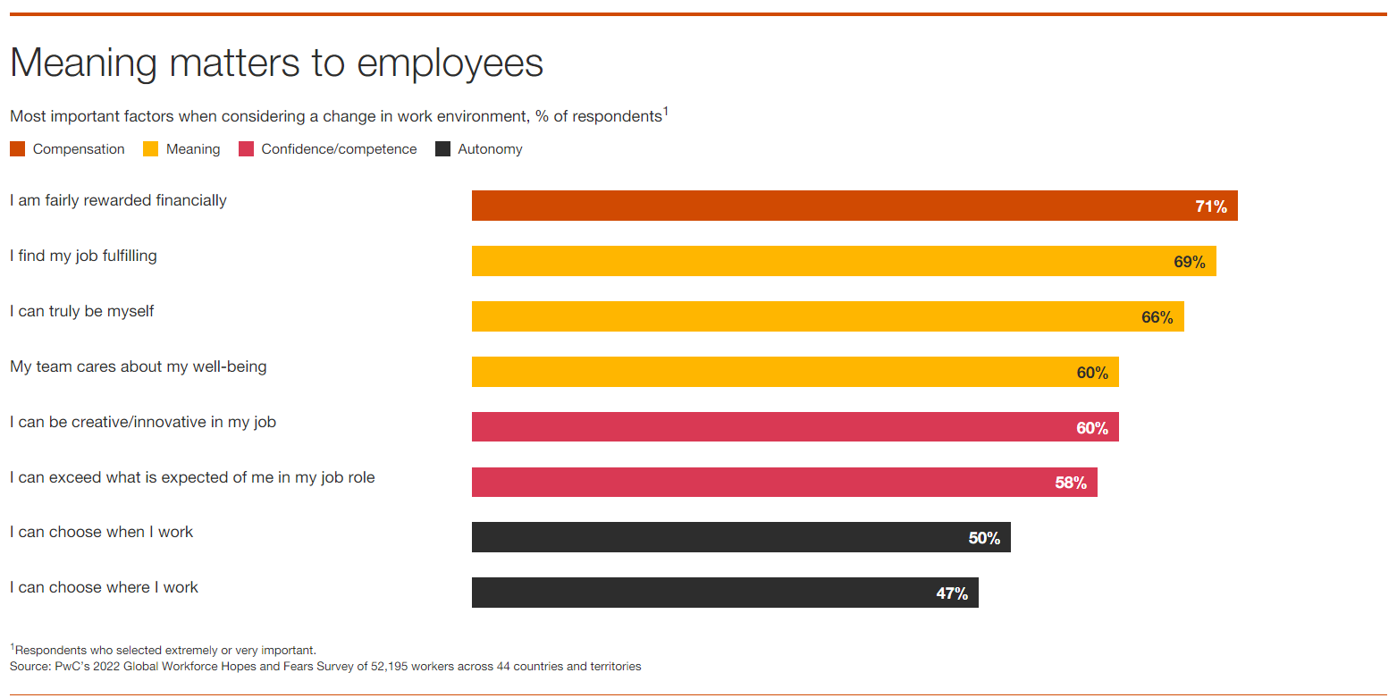 Motivations are not opaque: One of the world’s largest workforce surveys from PwC – more than 52,000 workers in 44 countries – found in June 2022 that pay was the main factor in people wanting to change jobs; although finding a fulfilling role was a close second (and likely to become even more important as inflation bites.)