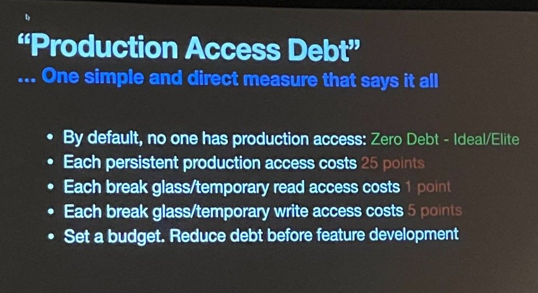 He proposes a budget for “production access debt”for example. (“Each persistent production access costs 25 points. Each break glass/temporary read access costs 1 point” etc.), proposing that organisations set a budget and aim to reduce debt before feature deployment to reduce risk.